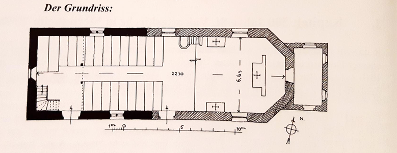 - Das Mauerwerk der Kirche steht namentlich auf der Südseite ca. 3 Fuß tief im Boden. Infolge dessen und besonders auch deshalb, weil der Untergrund (Lehm und Kalk) sehr wasserhaltig ist, sind die Mauern samt dem Bodenbelag von Feuchtigkeit und Nässe ganz durchsetzt. Im Winter überzeiht sich der Boden und das Mauerwerk mit einer Eiskruste. Dies geschieht so oft die Luft in der Kirche unter den Gefrierpunkt herabsinkt. Folgt Tauwetter, so ist die Kirche voller Nässe und Feuchtigkeit und er Aufenthalt in derselben sehr bedenklich für die Gesundheit.